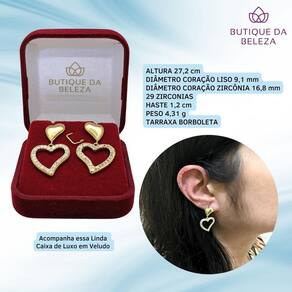 Especificações do produtoAltura 27,2mmDiâmetro coração liso 9,1mmDiâmetro coração com zircônia 16,8mm29 zircônias Haste 1,2cmPeso 4,31gTarraxa borboleta Descrição do produtoBrinco banhado a ouro 18k corações com pedras cravejadas Apresentamos a você a elegância em forma de semijoia.Peça formada por dois corações: 1 liso e outro repleto de zircônias, brilhantes sintéticos cravejados que fornecem brilho e beleza a semijoia. As zircônias são padrão aaa de qualidade e conferem ao brinco um toque de luxo.Seja para uso casual ou diurno você estará bem representada. Não perca essa oportunidade.Nós da butique da beleza temos as peças mais exclusivas para os clientes mais exigentes. O que oferecemos Um banho de ouro 18k, com qualidade , cor e tonalidade idênticas ao de uma peça de ouro 18k. Vendemos a experiência de você poder usar um produto arrojado, se sentir bela o e elevar sua autoestima. Marca: Butique Da Beleza