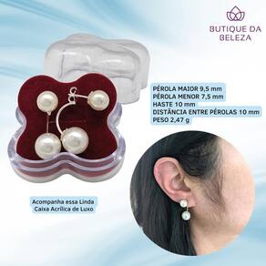 Brinco folheado a prata pérola grace 7,5 e 9,5mm semijoias em caixa de luxo especificações do produto pérola maior - 9,5mm pérola menor - 7,5mm haste - 10mm distância entre as pérolas - 10mm peso 2. 47g