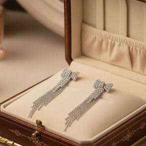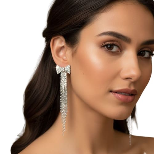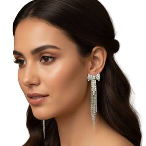 Brinco de pressão elegante, com design moderno em formato de laço cravejado de cristais e correntes longas que criam um visual sofisticado e cheio de brilho. Ideal para eventos, festas e ocasiões especiais, proporcionando conforto mesmo sem furos na orelha.