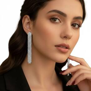 Brinco longo com fileiras de strass e acabamento refinado. Design elegante com caimento fluido, ideal para eventos formais, festas e ocasiões especiais. Possui fecho seguro e confortável, permitindo uso prolongado com leveza. O brilho composto por fileiras alinhadas valoriza o rosto e garante presença marcante no visual.