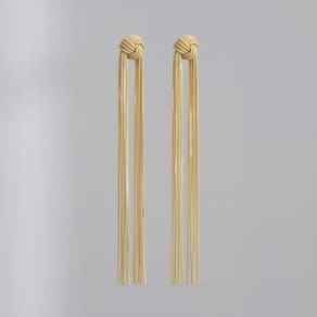 Brinco alongado com base em nó e franjas finas, proporcionando movimento e sofisticação ao visual. Ideal para eventos, festas, ocasiões especiais e composições modernas e sociais.