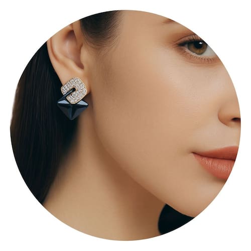 Com design diferenciado, esse brinco apresenta um formato losangular com zircônias brilhantes na parte superior e um cristal azul esculpido em corte piramidal na base. Um visual ousado e sofisticado.
