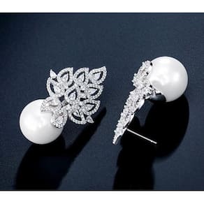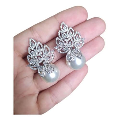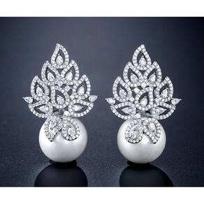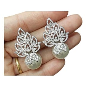 Brinco banhado a ródio com zircônias e pérolas Shell 3,7 cm de comprimento. Pérola com 1,4 cm de diâmetro. Semi jóia de ótima qualidade. Ideal para noivas, madrinhas, debutantes, formaturas e festas em geral. Simplesmente LINDO Acompanha caixinha de presente. Marca: De Castro Joias Ean: 7895252129776
