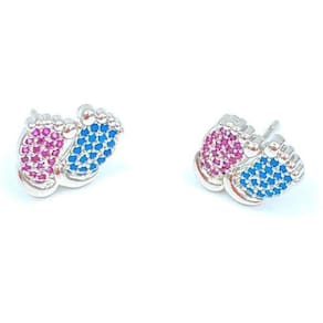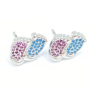 Brinco pezinho com zircônias azul e rosa folheada Ródio