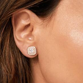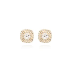 O brinco com zircônia branca cushion halo, com banho de ouro 18k, é uma peça deslumbrante e sofisticada.