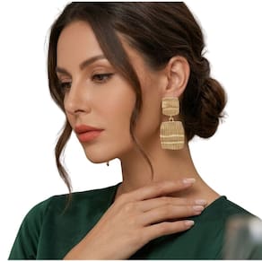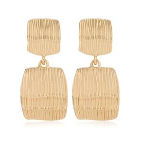 Brinco feminino com design geométrico moderno e acabamento dourado texturizado. O modelo possui duas peças retangulares conectadas que criam um visual sofisticado e elegante. A textura em relevo adiciona estilo e destaque ao acessório.