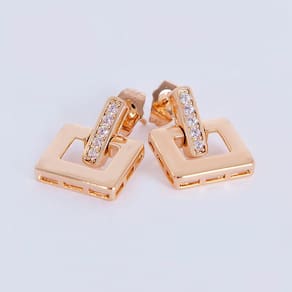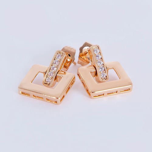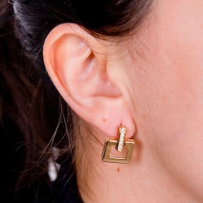 Um par de brincos com formas geométricas quadradas, banhado a ouro com aplicação de microzircônias cristais é luxuoso que te deixa em destaque em qualquer situação.