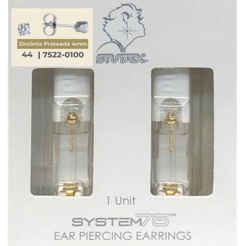 Brincos System 75 Studex, em aço inox, esterilizados. Folheados a Ouro 24k. Sistema descartável. Dispositivo acompanha o brinco. Colocação rápida, precisa e indolor, sem incomodar a criança. Para bebês e crianças até 10 anos. Dispositivo silencioso, para não assustar a criança. O brinco é encabulado e esterilizado individualmente, impossibilitando o contato manual com as partes perfurantes, sendo assim, muito higiênico. Elaborado em puro aço de grau médico, minimizando ao máximo as reações alérgicas.