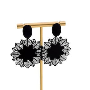 Lindo par de brincos em formato de circulo com flores em renda na cor preto, formato semelhante uma mandala, perfeito para qualquer ocasião, com a elegância da beleza feminina. Peças de excelente qualidade, com muita personalidade. Detalhes: material de liga de zinco, de excelente qualidade. Tamanho: 6,5 cm x 4,5 cm origem: produto importado