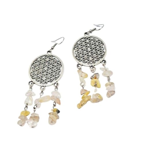 Flor da vida: A natureza está sempre nesse ciclo circular constante. Nesse sentido, a flor da vida representa a origem das coisas e, ao mesmo tempo, a conexão indissolúvel entre todas as coisas. Seu padrão é uma rede que interconecta todos os níveis do universo e representa a unidade com o todo, uma ideia levantada em muitas correntes filosóficas ao redor do mundo desde os tempos antigos. A flor da vida é a imagem sagrada da unidade do cosmos, é a matriz da qual tudo nasce e de onde tudo retorna. Quartzo rutilado. É uma pedra associada à vitalidade e à luz. Simboliza a energia nutritiva do sol. É recomendado em meditações e para limpar e energizar a aura. Favorece a concentração, o foco e a criatividade. Melhora a canalização e a conexão com guias pessoais e sabedoria interior. Ela também é adequada para trabalhos pessoais relacionados ao crescimento espiritual e à prosperidade. Características: Tipo de produto: Aros. Material: ganchos ruticados de quartzo, liga e aço. Técnicas de fabricação: Feito à mão Tamanho: 4,5 cm. de comprimento aprox. * A forma e a cor das pedras podem variar, pois são pedras is.