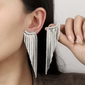 Design sofisticado com strass: Brincos longos com franjas decoradas com strass, ideais para quem deseja um visual glamouroso em casamentos e festas.Brilho prateado: O acabamento prateado, aliado ao strass, confere um brilho intenso, destacando o rosto em eventos noturnos.Comprimento longo: O formato pendente alongado traz elegância, realçando o look com um toque moderno e elegante.Material resistente e confortável: Fabricados com materiais de alta qualidade, os brincos são leves e duráveis, oferecendo conforto durante horas de uso.Estilo versátil: O visual prateado com strass é fácil de combinar com penteados e roupas de festa, adaptando-se a diversas produções.