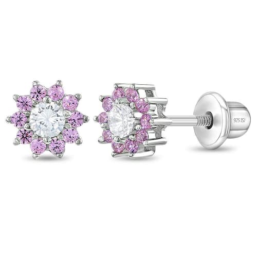 As meninas são adoráveis e gostamos de lembrá-las disso regando-as com coisas lindas, como flores. Este conjunto de brincos de zircônia cúbica rosa em torno de uma flor transparente no centro da CZ é o presente perfeito para sua princesinha. Feito inteiramente de prata esterlina 925, este par é ideal para pessoas com orelhas sensíveis e usa o design de rosca para manter os brincos no lugar, para que você não se preocupe em perder um. Embalado cuidadosamente em uma caixa de presente .