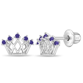 O par de brincos perfeito para a princesa da casa. Esses lindos brincos de coroa apresentam zircônia cúbica roxa brilhante e real em cada ponta da coroa para brilhar e brilhar. Feitos inteiramente em prata esterlina 925 e pedras de zircônia cúbica, eles são hipoalergênicos e seguros para crianças com orelhas sensíveis. Eles apresentam um brinco com rosca e uma parte traseira para garantir que os brincos de seu filho permaneçam seguros e confortáveis no lugar. Uma caixa de presente está incluída.