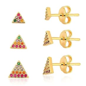 Brincos Trio de Triângulo Micro Zircônias Coloridas Semijóia