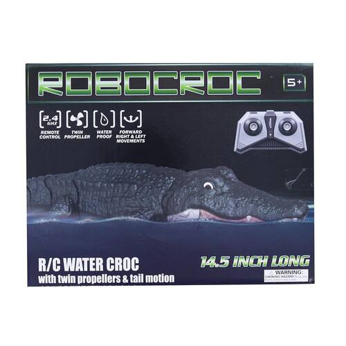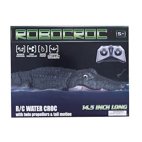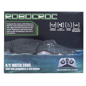 Conquiste as águas com Robocroc. Crocodilo R/C impermeável com movimento de cauda real, hélice dupla e controle multidirecional. O controle remoto tem uma frequência de 2,4 G para que você possa ter várias unidades nadando ao mesmo tempo. Robocroc é o presente perfeito para quem adora animais aquáticos. O controle remoto é muito fácil de operar, permitindo que entusiastas de peixes iniciantes e avançados se divirtam. Você pode nadar com o crocodilo em piscinas, grandes banheiras, lagos e lagoas.