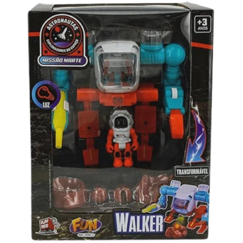 É um veículo-robô explorador, que emite luz, com acessórios.Contém:- 01 Explorador Mars Walker;- 01 Astronauta com Mochila;- 02 Pequenos recipientes;- 02 Pedras que brilham no escuro;- 01 Poço d'água;- 01 Pipeta para coletar água;- 01 Pilha de pedras.Marca: FunCódigo de barras: 7908489400935Modelo: F00813Idade: + 3 anosCertificado: INMETRO ce-bri/innac-01637-11a nbr nm 300/2004 ocp 0046