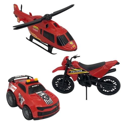 Kit Brinquedos Carro de Polícia + Moto + Helicóptero Vermelho