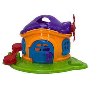 Acompanha 2 peças para encaixar no telhado, uma porta com chave, um cata-vento que faz barulho ao girar e uma gangorra para encaixar as peças na parte externa da casinha.