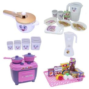 O kit vem com fogão com panelas, jogo de jantar, mercadinho, panela de pressão, potinhos de mantimentos, liquidificador