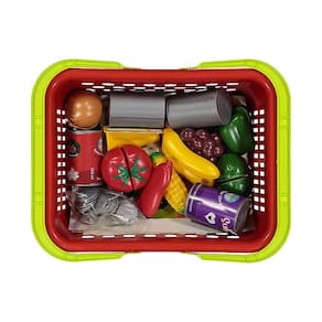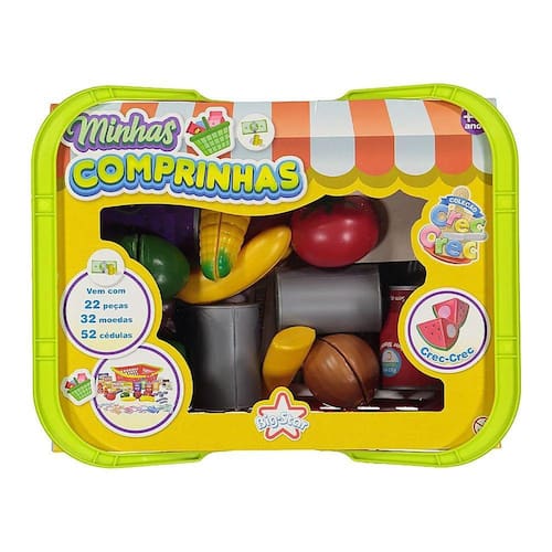 Conteúdo da embalagem: 1 Cesta, 1 Cebola, 1 Milho, 1 Pimentão, 1 Tomate, 1 Cacho de uva, 1 Limão, 2 Bananas, 1 Faca, 1 Catchup, 1 Mostarda, 2 Latas de refrigerantes, 2 Latas de ervilha, 1 Caixa de Biscoitos, 1 Caixa de Pão de forma, 1 Caixa de Rosquinhas, 1 Caixa de Pão Doce, 1 Caixa de Chá, 1 Caixa de Chocolate, 1 Caixa de Chá de camomila, 1 Conjunto de notas, 1 Conjunto de moedas, 7 Caixinhas de produtos diversos