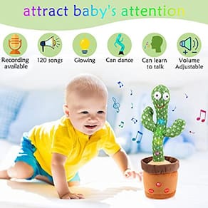 O brinquedo de cacto inteligente atualizado de Miaodam pode ajustar o volume da música! Há quatro níveis de volume podem ser ajustados, o nível mínimo é mudo, este brinquedo bebê pode cantar, dançar, gravar e imitar seu discurso, com 120 músicas em inglês