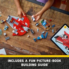 - Simples de montar – o Crimson Firehawk possui uma base de tijolos de partida para facilitar a construção e uma cabine com espaço para todos os 3 personagens, e a bicicleta speeder cabe na parte traseira da nave estelar