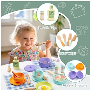 Acessórios Montessori: Feitos em madeira natural de alta qualidade, com formas realistas e cores vibrantes, seguindo princípios educacionais que cultivam habilidades práticas e cognição social via role-playing.