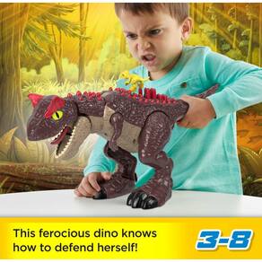 Fisher-Price Imaginext Mundo Jurássico Brinquedo Dinossauro Spike Strike Carnotaurus 28 cm para crianças pré-escolares a partir de 3 anos - As crianças podem criar histórias emocionantes do Mundo Jurássico com este dinossauro Carnotaurus de 28 cm de altura com incrível ação de golpe - Pressione o Power Pad para ver o dinossauro abrir a boca, avançar e abrir seus espinhos para se defender contra atacantes - Prenda o bebê Raptor nas costas do Carnotaurus para vê-la jogar fora o pequeno atacante quando seus espinhos forem soltos - Procure dinossauros, veículos e conjuntos adicionais Imaginext Jurassic World para brincadeiras de faz de conta mais adequadas para a pré-escola! (Cada um é vendido separadamente e sujeito à disponibilidade.) - Inspirado pela franquia Jurassic World, incentiva brincadeiras imaginativas e histórias para crianças em idade pré-escolar de 3 a 8 anos de idade