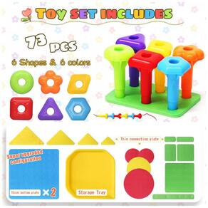 O brinquedo de encaixe pegboard com 73 peças foi desenvolvido para atividades de empilhamento, encaixe e construção simples em placas de base, estimulando organização espacial e coordenação motora fina em crianças. As peças permitem montar estruturas em diferentes alturas, criar pontes entre placas e formar desenhos com combinações de cores e formas, adequadas para uso doméstico e em salas de aula de educação infantil. A proposta segue princípios de atividades tipo STEM e Montessori, priorizando exploração sensorial, classificação de elementos e primeiros exercícios de contagem e sequência.