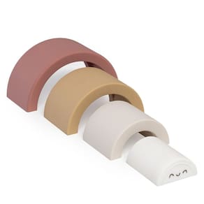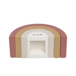 As peças formam um delicado arco-íris, com cores suaves e tamanhos diferentes, convidando o bebê a explorar encaixes, empilhamentos e combinações. Essas atividades estimulam a coordenação motora, o raciocínio espacial, a percepção visual e a criatividade, além de favorecerem a autonomia e a experimentação livre.