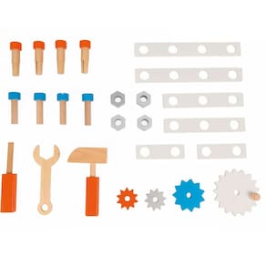 O que vem na embalagem? 1 Super Carrinho de Ferramentas Magnético Brico Kids Janod 3 Ferramentas magnéticas (martelo, chave de fenda e chave inglesa) 1 Torno 4 Engrenagens 18 Acessórios variados (pregos, parafusos, porcas e tábuas com diferentes furos)