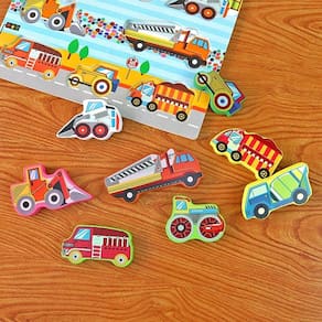 Brinquedo didático interativo em madeira com peças de transporte para encaixe.