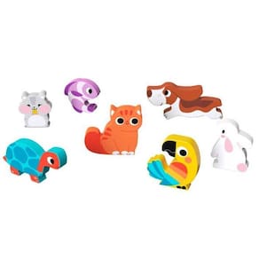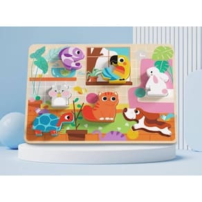 Descrição do Produto Desafie seu pequeno com este quebra-cabeça colorido e brilhante. Apresentando animais fofos de madeira, tente combinar o animal com o contorno do mesmo animal no quadro abaixo. Quando você se cansar desse quebra-cabeça desafiador, cada animal pode ser jogado sozinho. Essas peças são largas o suficiente para se sustentarem sozinhas em outras brincadeiras ou jogos de faz-de-conta.