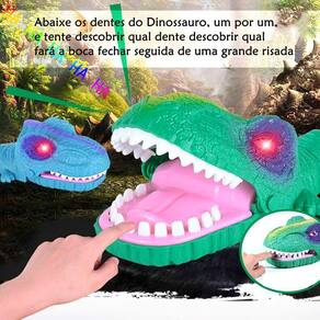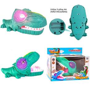 Dinossauro Maluco com Jogo de morder o DedoO dinossauro Maluco é proporciona a diversão com muito suspense, elaborado em modo de jogo, a boca fecha ao apertar uma sequência aleatória de dentes, que acabam acionando a grande boca, garantindo um leve susto, ele ainda solta uma grande gargalhada enquanto os olhos vermelhos piscam, este dinossauro é uma figuraEspecificações:Tipo: brinquedo jogo a pilha com Luz e Som Modelo: SD20117Composição: Polímeros Plásticos com componentes eletrônicosUtiliza duas pilhas AA (não inclusas)Certificado INMETRO CE-BRI/BRICS 00080 NM 300/2002Recomendação: Crianças á partir de 3 anosRecomendado brincar acompanhando de um adulto, por questões de segurança pressionar o dente utilizando um palito.Itens Inclusos:1 x Dinossauro Maluco