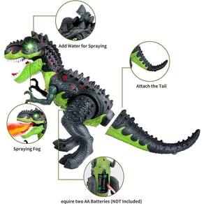 O brinquedo dinossauro T-Rex é operado por bateria e pode pulverizar névoa com luz LED vermelha, simulando o fogo da boca. Design realista com som estrondoso, mandíbula móvel e ótima textura na pele. Use a bisnaga que acompanha para encher com água e ligue o interruptor. O dinossauro caminha, faz um som e pulveriza a névoa. Divertido e interativo. O brinquedo elétrico de dinossauro T-Rex com fogo simulado, névoa de água, luz LED e efeito sonoro trará diversão sem fim. Este brinquedo também é uma ótima ferramenta educacional para as crianças aprenderem mais sobre o dinossauro e a cultura pré-histórica.