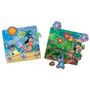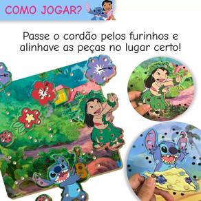 O jogo educativo Alinhavos Stitch Disney, Nig Brinquedos é uma atividade lúdica e educativa que visa desenvolver a coordenação motora fina, a concentração e a criatividade das crianças a partir de 3 anos. O conjunto inclui 17 figuras do Stitch em madeira, 2 placas de madeira, 6 cadarços coloridos. A criança deve passar os cadarços pelos furinhos das peças, estimulando habilidades essenciais para o aprendizado da escrita.