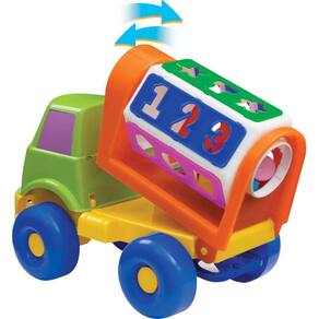 O caminhão sorriso transporta alegria em seu container didático, acompanhado de peças geométricas, letras e números para encaixe.