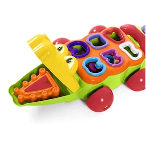 Ele é um jacaré muito simpático que vem com formas didáticas de cores diferentes e encantadoras letrinhas a, b e c e números 1,2 e 3 que encaixam no corpo do brinquedo, um lindo telefone com discador e também este lindo jacaré abre e fecha boca e possuiu uma super lingua didatica além disso ele possui rodinhas livres para puxar e levar o amiguinho para passear. Além de divertido, este brinquedo é criativo e cheio de aprendizado