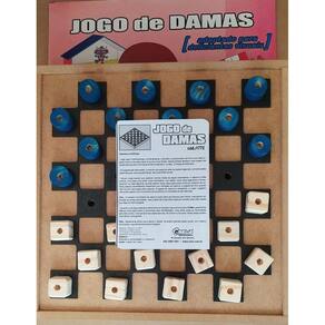 Brinquedo educativo jogo de damas adaptado estojo em mdf - carlu 1772 jogo de damas adaptado braille Composto por 1 caixa tipo estojo em mdf Medindo 30 x 30x 30 x 4 cm , Parte inferior contém o tabuleiro de dama em baixo relevo para identificação das casas e furos para encaixe das peças. Acompanham 24 peças adaptadas para o jogo 12 peças redondas pintadas 12 peças quadradas natural Caixa em mdf tamanho 30 x 30x 4 cm