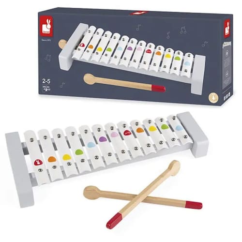Características: Marca: Janod Idade recomendada: 2 a 5 anos Material: Madeira e metal Contém: 1 xilofone com 12 notas + 2 baquetas Dimensões aproximadas: 38 x 16 x 4,5 cm