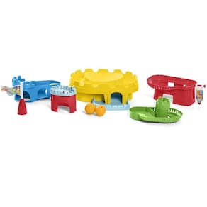 São quatro andares para as bolinhas deslizarem. E vem com bandeiras para identificar o reino que é inteiramente desmontável!