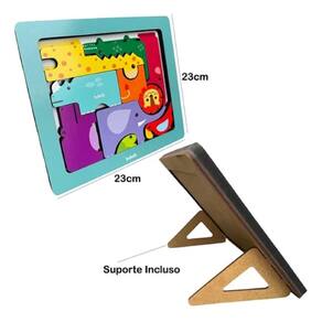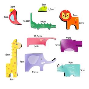 Dimensões aproximadas dos animais incluídos no brinquedo: - Girafa: 15 × 6 cm - Jacaré: 10,3 × 6,8 c - Rinoceronte: 9,7 × 5 cm - Leão: 8 × 8 cm - Elefante: 13 × 7 cm - Tamanduá: 3,7 × 13 cm - Pássaro: 6,3 × 5 cm - Sapo: 3,5 × 2 cm - Hipopótamo: 9 × 5 cm Espessura de todas as peças: 0,9 cm T