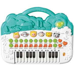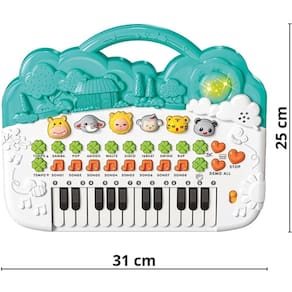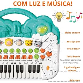 Com 24 teclas de piano, o brinquedo possui oito músicas demostrativas, oito ritmos, músicas, sons, luz e controle de volume.