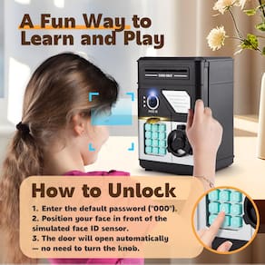 - ?Recursos de segurança de alta tecnologia?Este cofrinho ATM possui proteção por senha e reconhecimento facial simulado para segurança extra. Basta inserir um código de 3 dígitos e manter seu rosto na luz azul piscante para desbloquear as crianças seguras. É uma maneira divertida e de alta tecnologia de manter seus tesouros seguros!