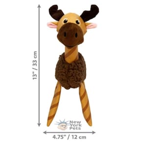 Sobre este item •Este brinquedo tem um corpo de lã fofo com um grande apito para diversão sem fim. •A cabeça e as pernas de couro sintético realçam as características multissensoriais do brinquedo. •As pernas são preenchidas com material amassado para criar ruídos de chicote e estalo durante a brincadeira. •Convide seu cãozinho a sacudir, mastigar, bater e arremessar este brinquedo de alce para uma brincadeira ativa. •Este brinquedo de pelúcia é feito com materiais macios para uma brincadeira suave e abraços reconfortantes.