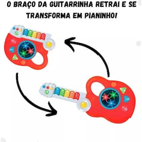 Guitarra Piano e Tambor Musical da Braskit.Com a Guitarrinha 3 em 1 a Diversão Não Vai Ter Fim! Além de Guitarra, Ela Se Transforma em Pianinho com Um Mini Tambor Para Aprimorar Ainda Mais a Composição! o Braço da Guitarrinha Retrai e Se Transforma em Pianinho!Com Luzes Brilhantes, Sons de Bateria e Sons de Guitarra.A Guitarra Mede Aproximadamente 37cm de Comprimento