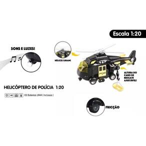 O helicóptero de Polícia ou Bombeiro Resgate é um brinquedo super realista com luzes e sons de verdade. Ao apertar o botão na lateral da porta que as hélices começam a girar, conforme aperta a hélice gira e gira. Cordas descem com a maca para socorrer o acidentado. Possui rodas com fricção, ou seja, é só pressionar o carrinho em uma superfície e puxar ou empurrar que ele vai andar sozinho.