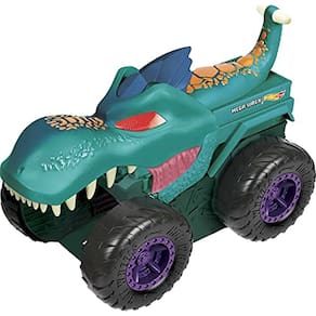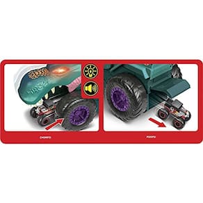 O enorme veículo Hot Wheels Monster Trucks Car Chompin's Mega Wrex ganha vida com luzes e sons! Empurre sua cauda e Mega Wrex vai comer em 1:64 em escala de carros die-cast e Hot Wheels Monster Trucks. Este playset de caminhão monstro favorito dos fãs é imperdível para crianças de 3 anos ou mais. Não só inclui efeitos sonoros e luzes incríveis — depois de comer veículos, ele os caga! Inclui um carro de lança-mor Hot Wheels. As crianças podem experimentar a emoção de bater e esmagar diversão e adicionar este conjunto ultrajante ao seu mundo de Monster Trucks. Cada um vendido separadamente, sujeito à disponibilidade. As cores e decorações podem variar.