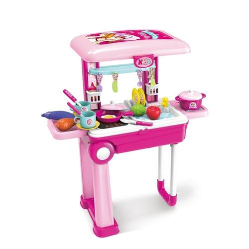 A cozinha maleta 2 em 1 possui diversas comidas e acessórios para cozinhar e se divertir. Com o objetivo de trazer o faz de conta o mais perto da realidade! A cozinha possui um fogão com luzes, uma pia e escorredor de prato. Uma bancada de cozinha completa com acessórios essenciais do mundo gastronômico, comidinhas, louça, descanso para apoiar, e tudo isso portátil sobre rodas para levar a brincadeira onde quiser com facilidade!