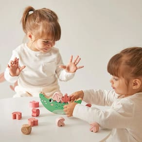 Jogo de Equilíbrio do Crocodilo – o desafio é empilhar até 12 folhas de madeira no dorso do crocodilo sem deixar cair! Um jogo que desenvolve paciência, destreza e concentração.